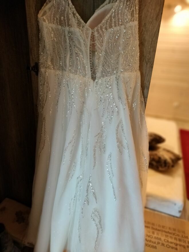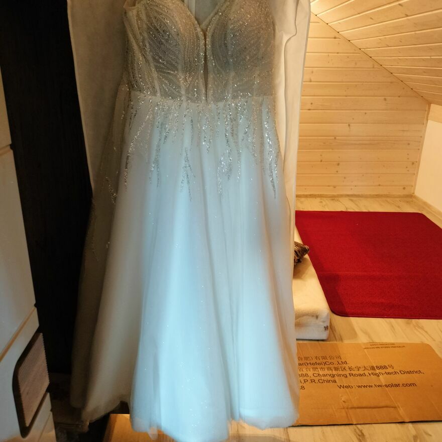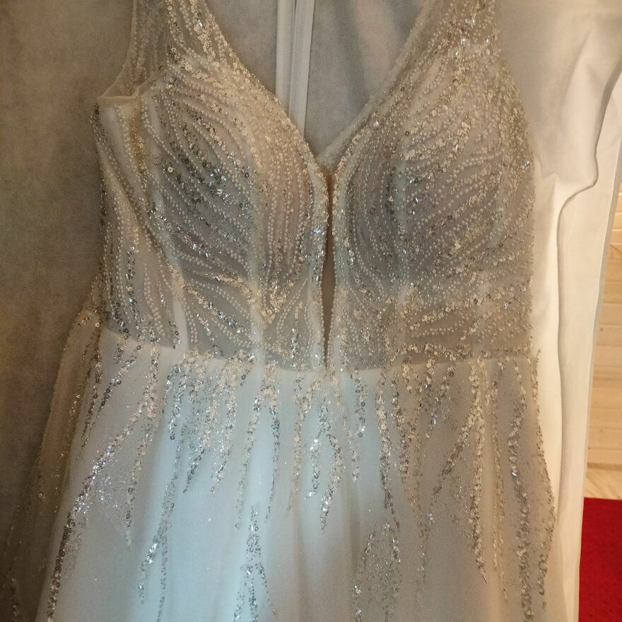 Witam posiadam do sprzedania przepiękną suknię ślubną ze srebrnymi dodatkami zdobioną na około sukni widocznych na zdjęciach zarówno też jest obsypana połyskiem . W biuście 112 cm . Suknia do odświeżenia .Suknię tą bardzo polecam .