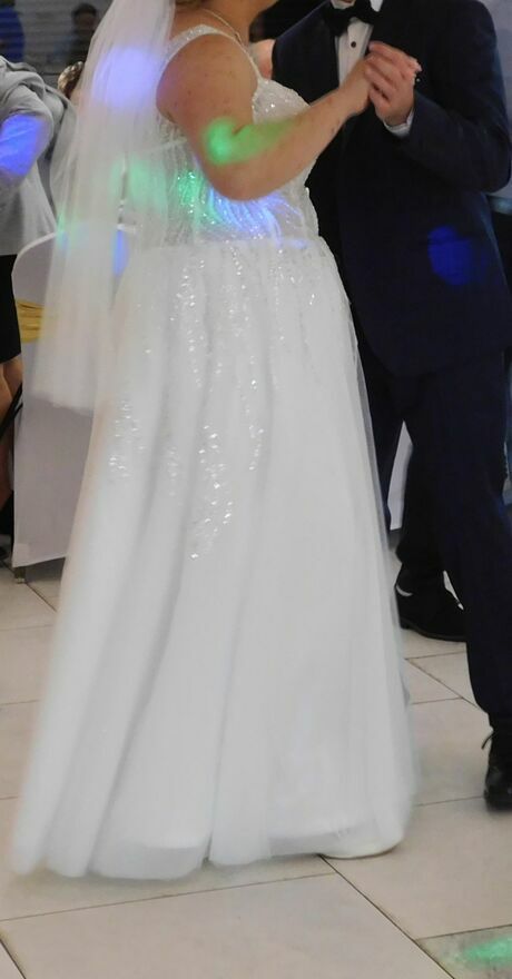 Pięknie prezentuje się w tańcu wszyscy goście podziwiali . Posiadam nowe pończochy 3/4 białe dla zainteresowanych .
